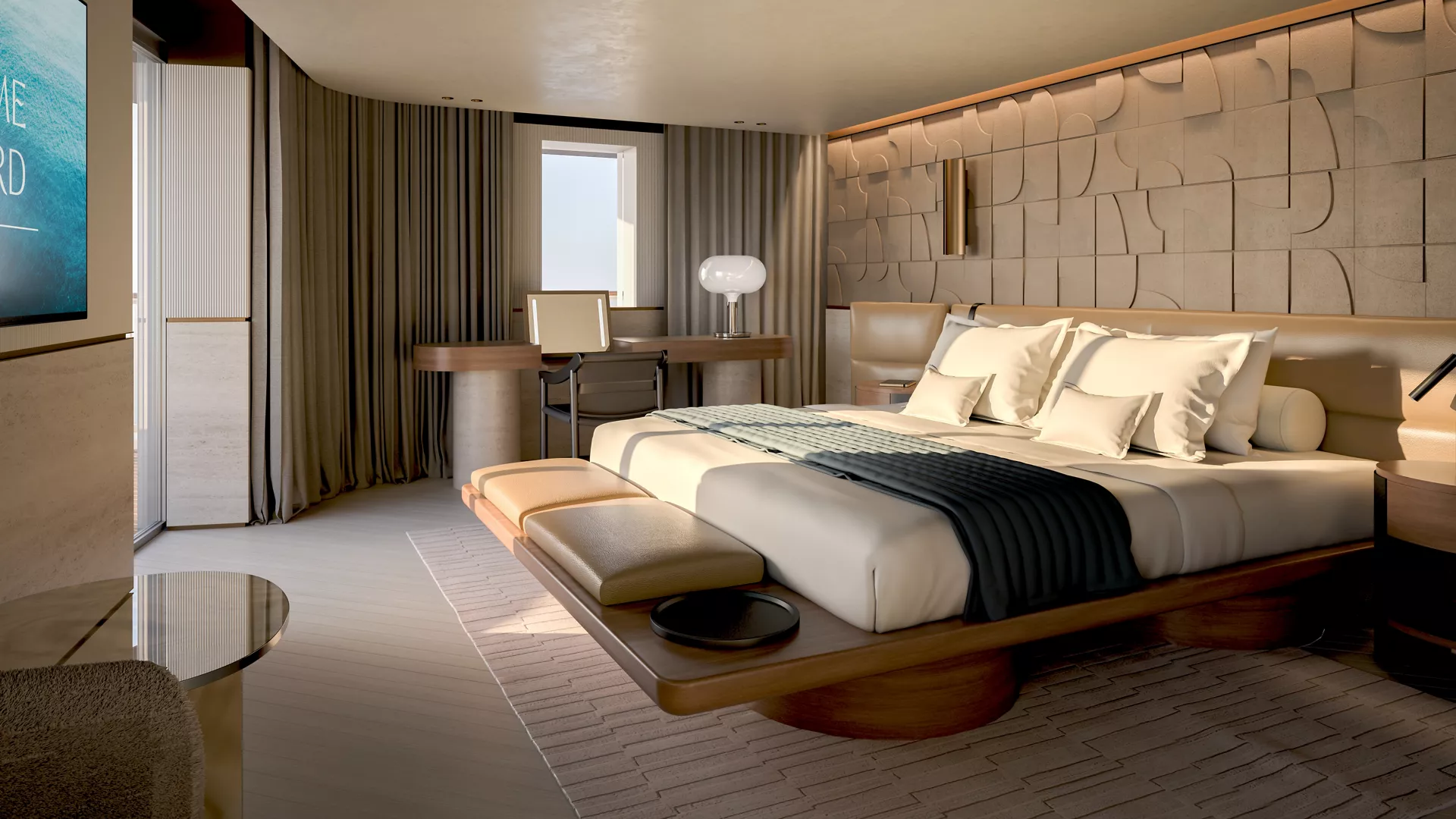 Cada uno de sus barcos ha sido concebido como un hotel boutique de alta gama. Todas las suites están orientadas al mar, con terrazas privadas, ventanales de suelo a techo y amplios interiores que evocan discreción y refinamiento. El objetivo es que el huésped experimente una sensación de hogar en alta mar sin renunciar a la excelencia del servicio intuitivo.